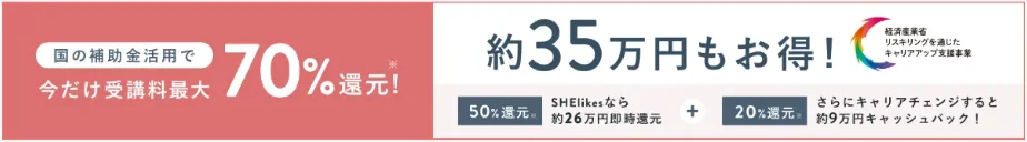 また、リスキリング補助金制度の対象スクールであり、受講料の最大70%が還元されるため、金銭的な負担を抑えながらスキルを習得可能。新しいスキルを学びたい、環境を変えたい、仕事の幅を広げたい——そんなあなたの「なりたい」を叶える第一歩を、SHElikesで踏み出してみましょう。