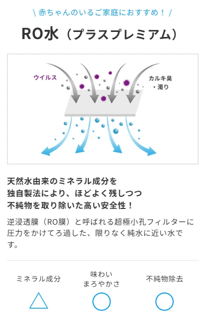 RO水はクセがなく、価格も2,696円(税込)~と安め。「毎日ガブガブ使う家庭」「小さなお子様がいるご家庭」との相性がとても良いです。