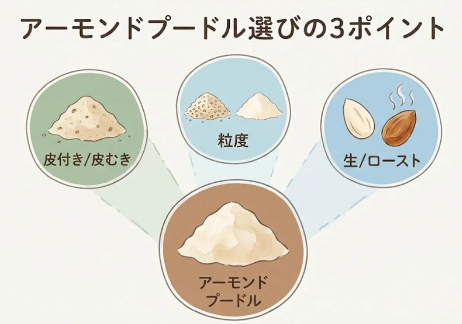 アーモンドプードルは、どれを選んでも同じに見えますが、香りの強さ・粒度(細かさ)・皮付きかどうかの3つが仕上がりを大きく左右します。