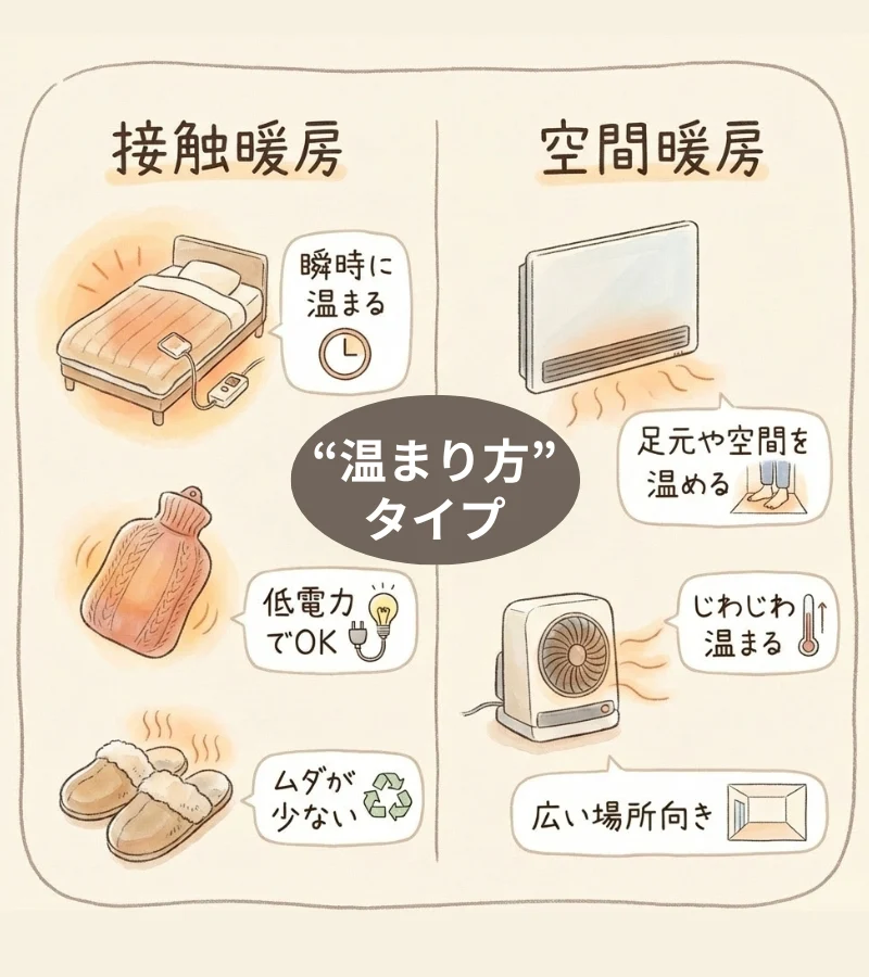 体に触れて熱を届ける“接触型”は、小さな電力でも早く暖まり、冷えをピンポイントで解消しやすいのが特徴です。湯たんぽや電気毛布がまさにこれに当たります。