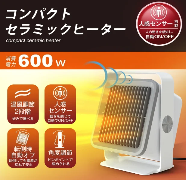 | MOTIFUN ヒーター | ![]() | 3,580円 | セラミック | AC | 400/600W | 12.4〜18.6円/h | 2段階 | 15.3×10×19.7 | 人感センサー |