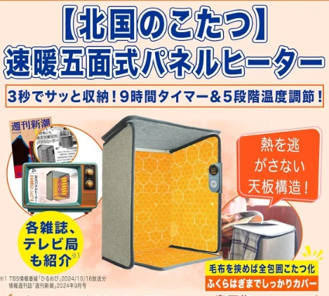 | 北国のこたつ 5面式 | ![]() | 7,999円 | パネル | AC | 195W | 2.7円/h | 5段階 | 40×55×55 | 10秒速暖 |