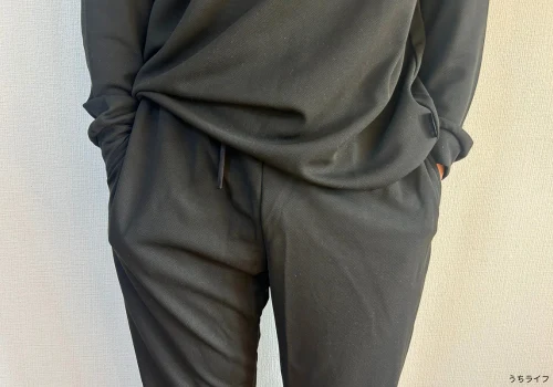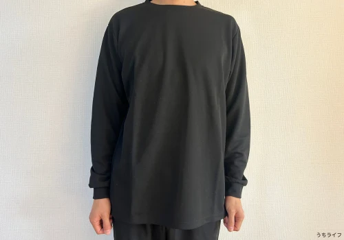 通気性が高いため、布団の中でも熱がこもりにくく、「寝ているときに暑がりやすい人」や「汗ばみがち」な人ほど快適さを感じやすいタイプといえます。また、シンプルで落ち着いたデザインなので、部屋着としてそのまま過ごしても違和感がありません。寝る前の“整う時間”に自然と寄り添ってくれるウェアでした。