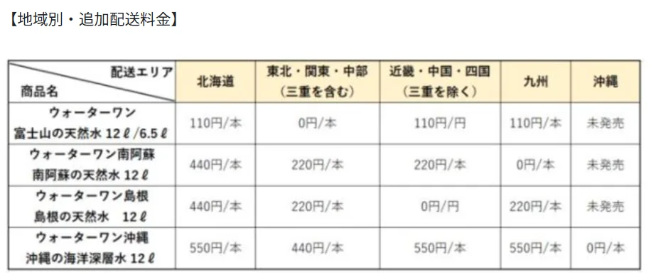 ウォーターワンは採水地・配送料の無料対象エリアが設定されています。一部地域では無料ですが、対象外の場合は送料が発生し、月額コストが思ったより増える可能性があります。契約前に「自分の住所での送料」を確認することが重要です。